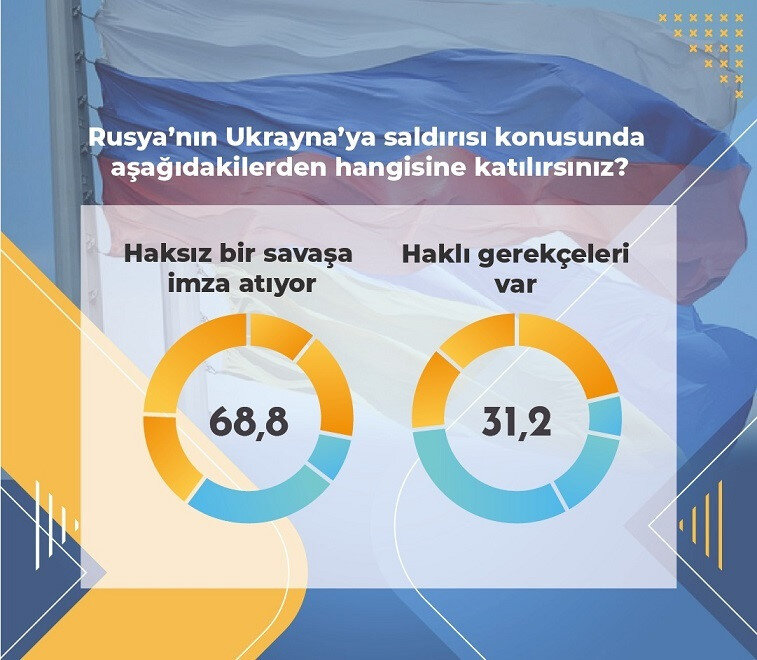 Araştırma sonuçlarına göre, katılımcıların yüzde 68,8’i Rusya’nın haksız bir savaşa imza attığını düşünüyor. Buna karşın katılımcıların yüzde 31,2’si ise Rusya’nın kendine göre haklı gerekçelerinin olduğunu ifade etti.