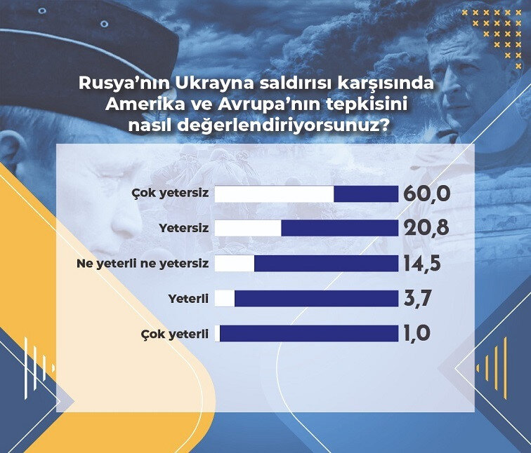 Areda’nın yönelttiği bir başka “Rusya’nın Ukrayna saldırısı karşısında Amerika ve Avrupa’nın tepkisini nasıl değerlendiriyorsunuz” sorusuna karşılık, araştırmaya katılanların yüzde 60’ı Amerika ve Avrupa’nın, Rusya’nın Ukrayna’ya saldırısı karşısında çok yetersiz kaldığını düşünürken, yüzde 20,8’i ise yetersiz kaldığını belirtti.