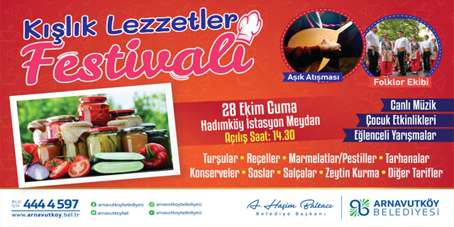 Arnavutköy Belediyesi Kültür İşleri Müdürlüğü koordinasyonunda düzenlenecek olan Kışlık Lezzetler Festivali ile ülkemizde genellikle kış aylarında tüketilmek üzere hazırlanan geleneksel yiyeceklerin tanıtımı yapılacak. Kışlık lezzetlerin tanıtılacağı festivalde; turşular, konserveler, soslar, salçalar ve diğer lezzetlerin tarifleri yer alacak. 3 gün sürecek olan festival; 28-29-30 Ekim tarihlerinde devam edecek.