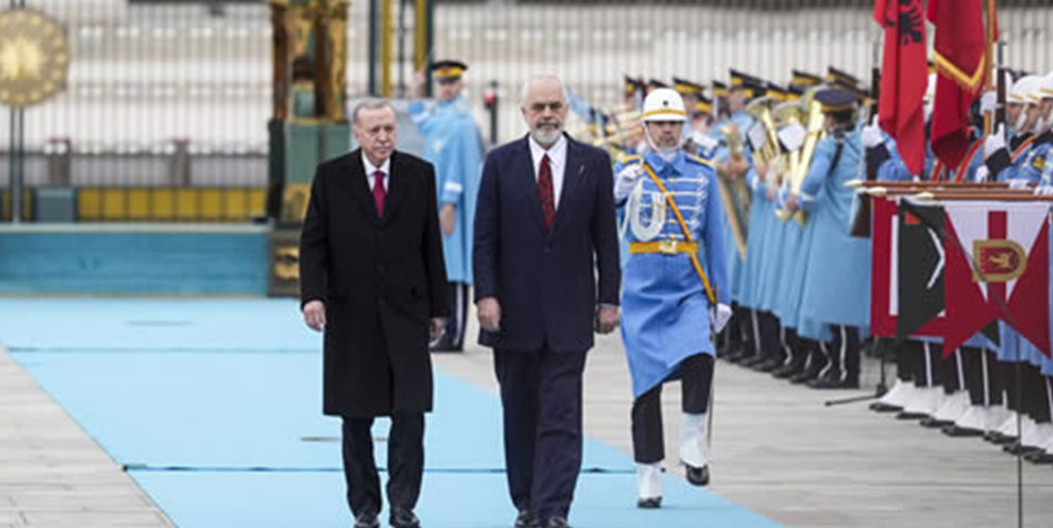 Cumhurbaşkanı Erdoğan ve Arnavutluk Başbakanı Rama’nın tören alanındaki yerlerini almalarının ardından iki ülkenin millî marşları çalındı. Arnavutluk Başbakanı Rama’nın tören kıtasını selamlamasından sonra iki lider heyetlerini birbirlerine takdim etti.