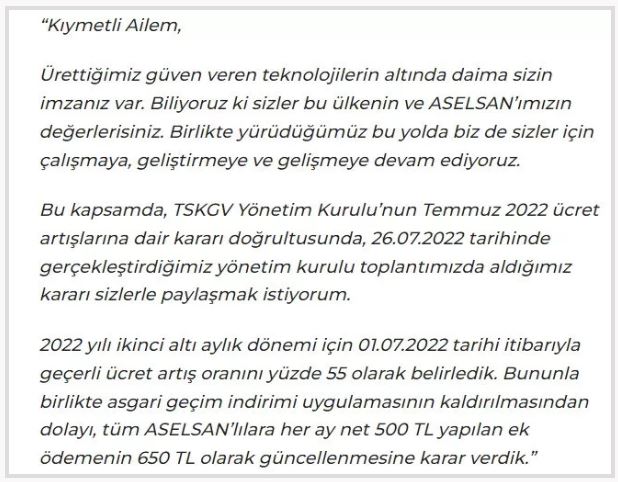 ASELSAN, 9 bini aşkın çalışanına yüzde 55 oranında zam yaptı. Zam 1 Temmuz 2022’den itibaren geçerli olacak.