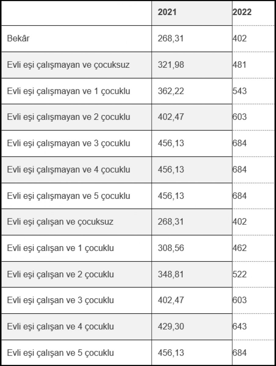 (Çalışanın; bekar, evli, eşinin çalışıp çalışmaması ve çocuk sayısına göre alacağı AGİ de arttı. 2021’deki en düşük AGİ 268,162 lira, en yüksek ise 456,12 liraydı.)