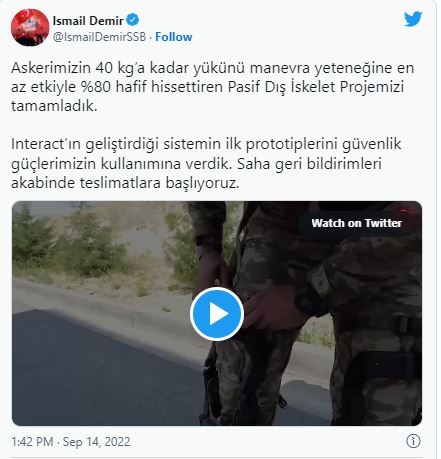 Paylaşımında askerin 40 kilograma kadar yükünü, manevra yeteneğine en az etkiyle yüzde 80 hafif hissettiren "Pasif Dış İskelet Projesi"nin tamamlandığını belirten Demir, "Interact'ın geliştirdiği sistemin ilk prototiplerini güvenlik güçlerimizin kullanımına verdik. Saha geri bildirimleri akabinde teslimatlara başlıyoruz." ifadelerini kullandı.