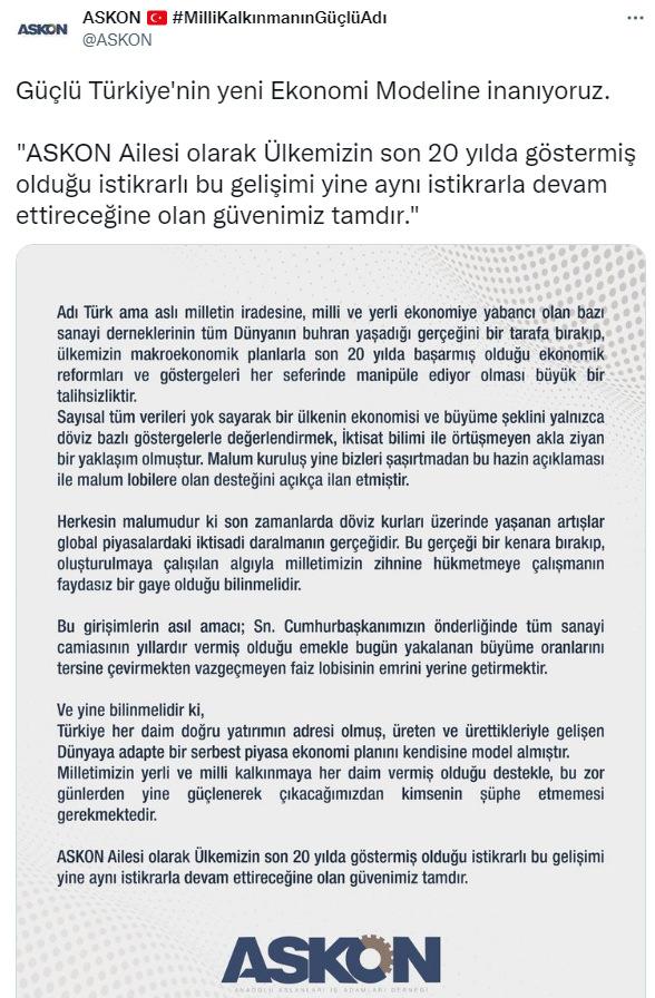 Yeni ekonomik programını desteklediklerini duyuran ASKON tarafından yapılan açıklamada, "Milletimizin yerli ve milli kalkınmaya her daim vermiş olduğu destekle, bu zor günlerden yine güçlenerek çıkacağımızdan kimsenin şüphe etmemesi gerekmektedir." ifadelerine yer verildi.