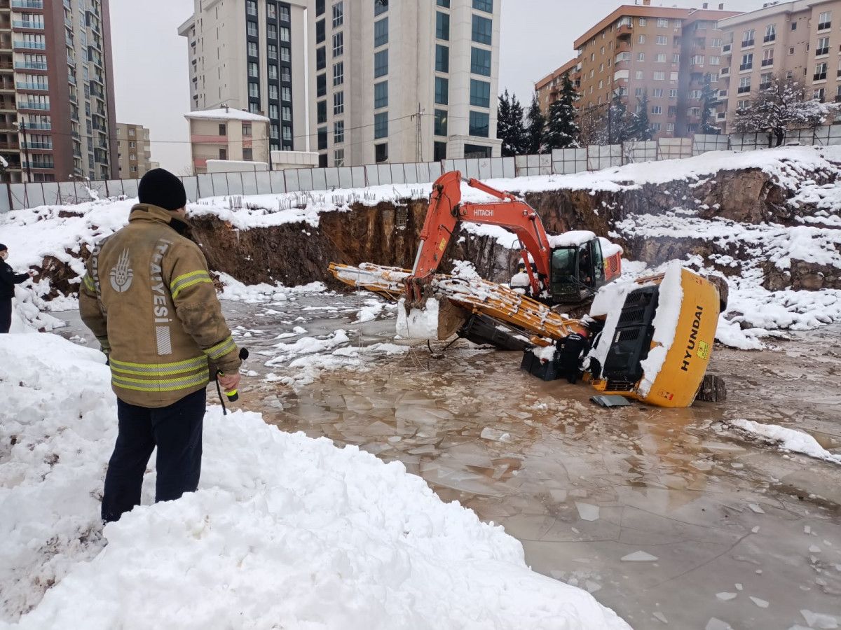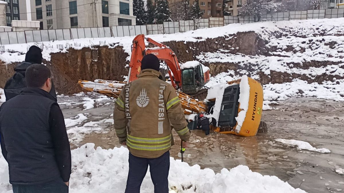 İş makinası, buz tutan su birikintisine düşerek, devrildi. İhbar üzerine olay yerine itfaiye, sağlık ve polis sevk edildi.