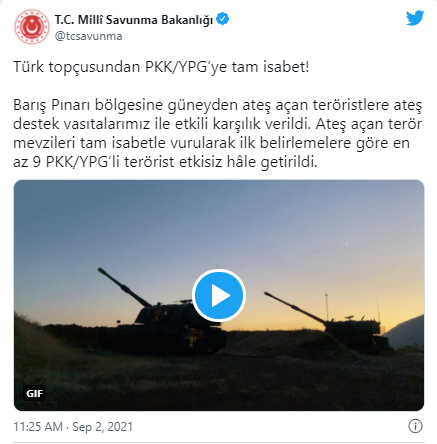 "Barış Pınarı bölgesine güneyden ateş açan teröristlere ateş destek vasıtalarımız ile etkili karşılık verildi. Ateş açan terör mevzileri tam isabetle vurularak ilk belirlemelere göre en az 9 PKK/YPG’li terörist etkisiz hâle getirildi."