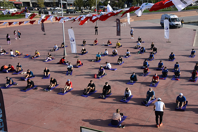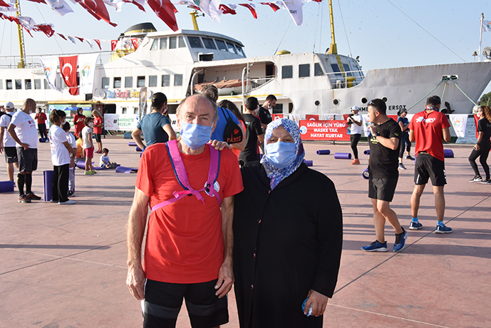 Yürüyüş ve bisiklet sürme etkinliğinin tamamlanamsının ardından başlangıç noktası olan Mehmet Akif Ersoy Gençlik Gemisi önüne geri gelen sporseverler burada egzersiz hareketleri yaptı.