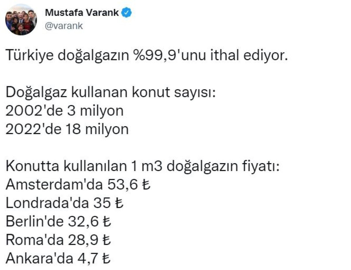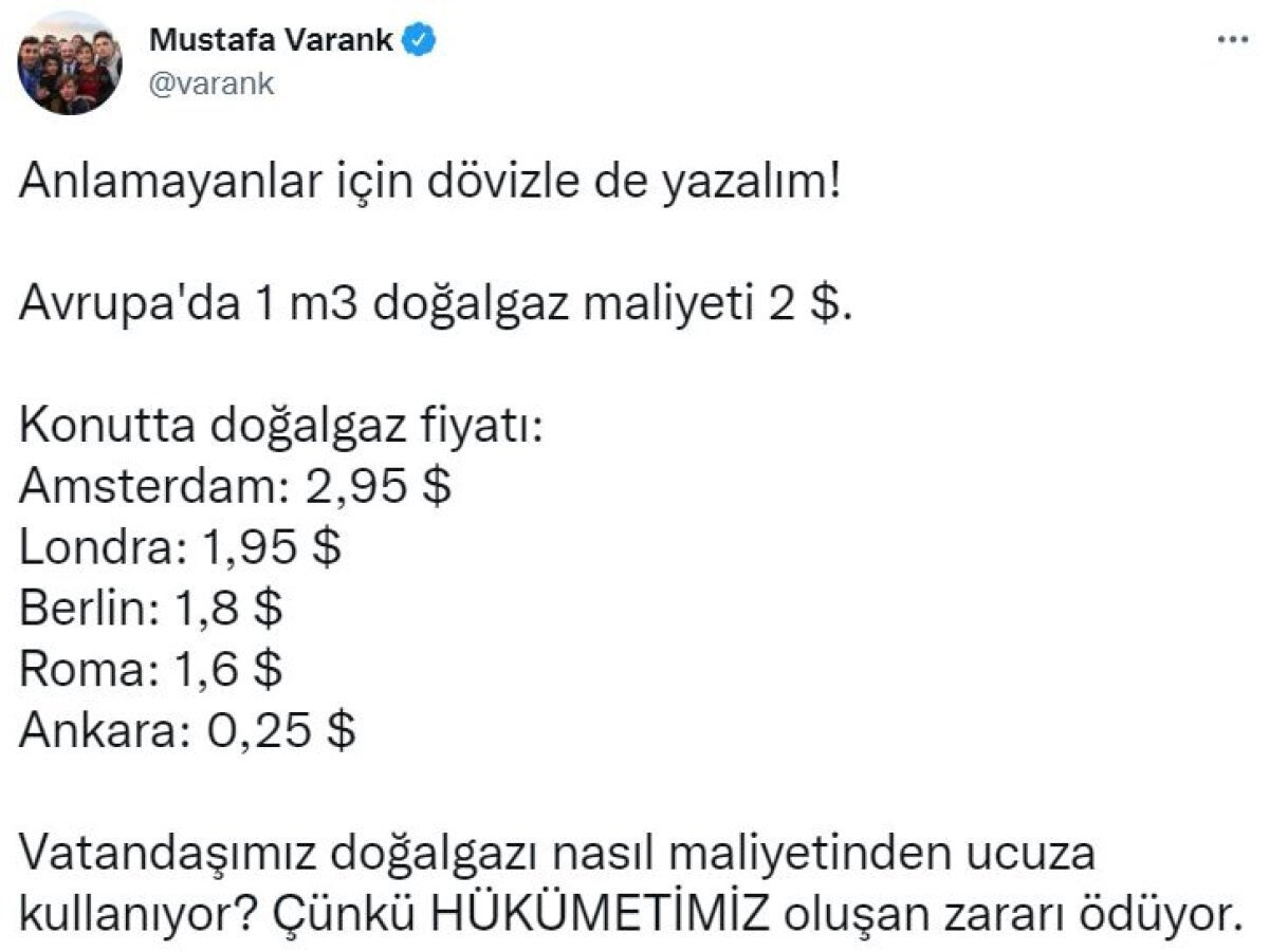 Yeni bir paylaşımda bulunan Sanayi ve Teknoloji Bakanı, "Anlamayanlar için dövizle de yazalım! Avrupa'da 1 metreküp doğalgaz maliyeti 2 dolar." dedi. Mustafa Varank, konutta gaza ilişkin, "Amsterdam: 2,95 dolar, Londra: 1,95 dolar, Berlin: 1,8 dolar, Roma: 1,6 dolar, Ankara: 0,25 dolar." dedi.