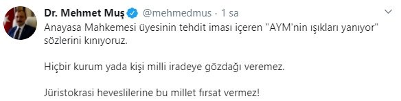 AK Parti'den ilk tepki Grup Başkanvekili Mehmet Muş'tan geldi. Muş, "Anayasa Mahkemesi üyesinin tehdit iması içeren "AYM'nin ışıkları yanıyor" sözlerini kınıyoruz. Hiçbir kurum yada kişi milli iradeye gözdağı veremez. Jüristokrasi heveslilerine bu millet fırsat vermez!" dedi.