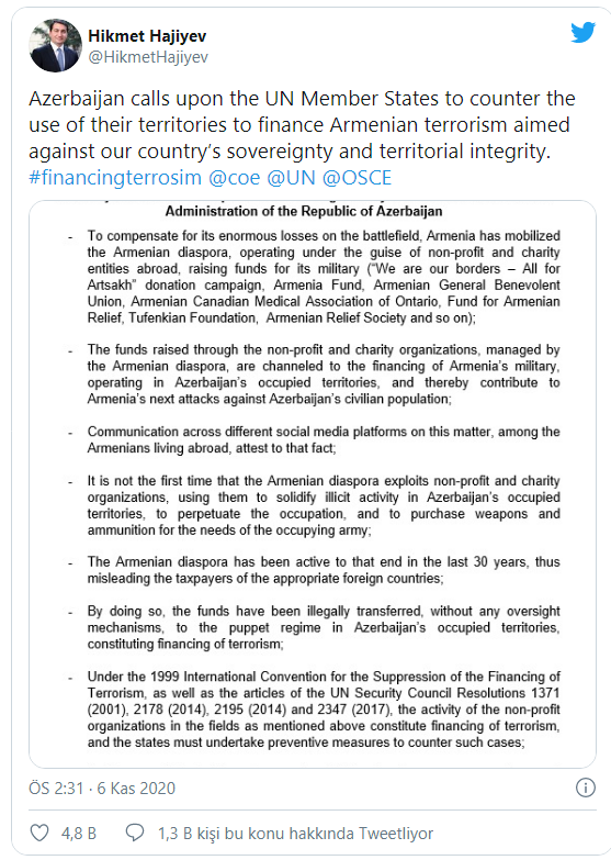 Azerbaycan Cumhurbaşkanı Yardımcısı Hikmet Hacıyev, bu durumun engellemesi için Birleşmiş Milletler (BM) üyesi ülkelere Twitter hesabından seslenerek söz konusu bağışların toplanmasını engellemeleri için çağrıda bulundu.