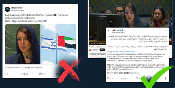 "Bazı sosyal medya hesaplarından paylaşılan, 'BAE Uluslararası İşbirliği Bakanı Reem El Haşimi, 'Bütün özgür Araplar İsrail'in yanındadır' dedi' iddiası doğru değildir. Birleşik Arap Emirlikleri (BAE) Uluslararası İşbirliğinden Sorumlu Devlet Bakanı Reem bint İbrahim El Haşimi'nin, Birleşmiş Milletler Güvenlik Konseyi'nde yaptığı açıklamada böyle bir ifade kullanmadığı tespit edilmiştir. BAE Devlet Başkanı Danışmanı Enver Gargaş da Reem El Haşimi'nin Gazze ve İsrail hakkındaki konuşmasının kesilip çarpıtıldığını açıklamıştır."