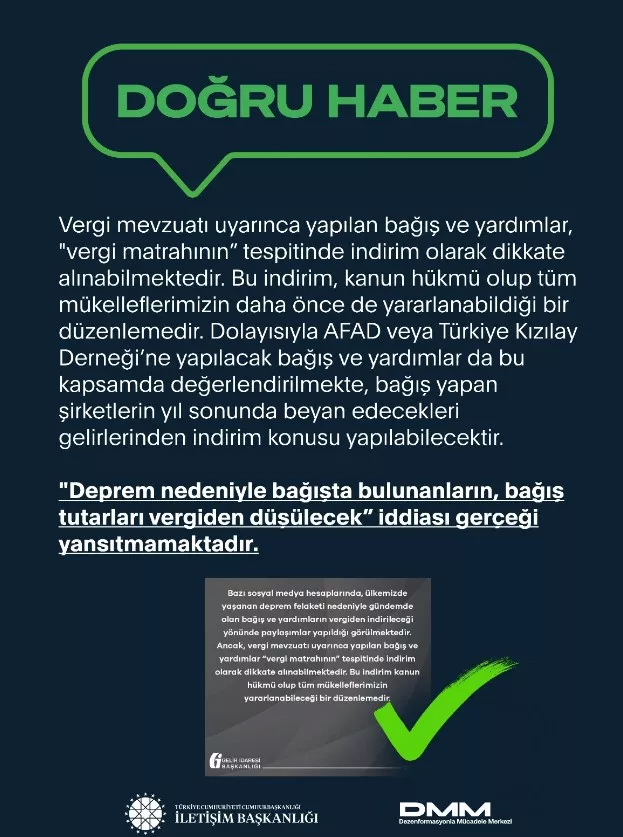 "Sosyal medyada, yapılan bağış ve yardımların vergiden düşüldüğü yönünde paylaşımların devam ettiği görülmektedir.