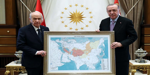 MHP lideri Devlet Bahçeli, hafta sonu Ülkü Ocakları’nı ziyaret etti. Ziyarette Bahçeli’ye çerçeve içerisinde bir fotoğraf hediye edildi. Üzerinde harita bulunan fotoğraf, Twitter üzerinden paylaşılınca da Yunanistan ayağa kalktı.