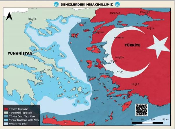 Haritada, “Denizlerdeki misakımillimiz” ibaresi yer alırken, birçok Yunan adası ve Girit’in de Türkiye’ye ait olduğu görüldü.