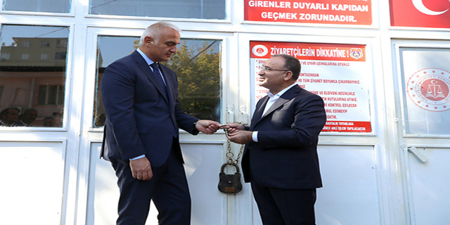 Diyarbakır Cezaevi'ndeki incelemesinin ardından kapıyı kilitleyen Bakan Bozdağ, anahtarı Kültür ve Turizm Bakanı Ersoy'a teslim etti.