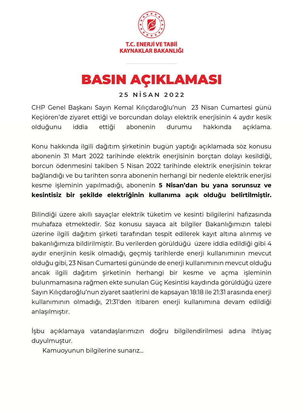 "Sn. Kılıçdaroğlu; anlaşılan o ki elektrik sayaçlarının artık akıllı olduğu, abonenin tüketim miktarı ve kesinti bilgilerini tarih-saat olarak hafızasında saklamakta olduğunu bilmiyorsunuz. Zira bunları bilseydiniz o iddialarda bulunamazdınız.