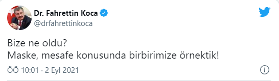 Bakan Koca: Bize ne oldu?Sağlık Bakanı Fahrettin Koca, sosyal medya hesabından maske ve mesafeye yönelik sitem dolu bir paylaşımda bulundu.02 Eylül 2021, Perşembe - 11:09 Sağlık Bakanı Fahrettin Koca, koronavirüse karşı maske ve sosyal mesafe önlemlerinin önemine dikkat çeken bir paylaşımda bulundu.Bakan Koca, şu ifadeleri kullandı:"Bize ne oldu? Maske, mesafe konusunda birbirimize örnektik!"Etiketler: Fahrettin Koca aşı kovid-19