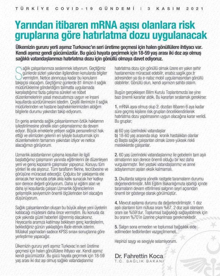 Bilim Kurulu toplantısı sonrası Sağlık Bakanı Fahrettin Koca'dan paylaşım geldi. Koca "Yarından itibaren mRNA aşısı olanlara risk gruplarına göre hatırlatma dozu uygulanacak." ifadelerini kullandı.