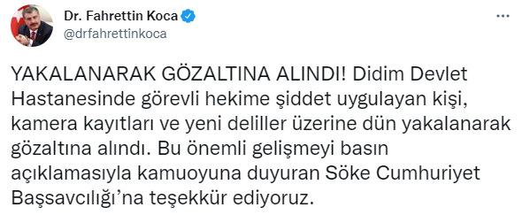 Koca'nın yaptığı yeni açıklamada ise şahsın tekrar gözaltına alındığı bilgisi yer aldı. Bakan Koca, Twitter hesabından yaptığı açıklamada "Yakalanarak gözaltına alındı. Didim Devlet Hastanesinde görevli hekime şiddet uygulayan kişi, kamera kayıtları ve yeni deliller üzerine dün yakalanarak gözaltına alındı. Bu önemli gelişmeyi basın açıklamasıyla kamuoyuna duyuran Söke Cumhuriyet Başsavcılığı'na teşekkür ediyoruz" dedi.