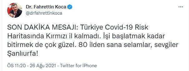 Sosyal medya hesabından açıklama yapan Bakan Koca, 'SON DAKİKA MESAJI: 'Türkiye Covid-19 Risk Haritasında Kırmızı il kalmadı. İşi başlatmak kadar bitirmek de çok güzel. 80 ilden sana selamlar, sevgiler Şanlıurfa!'' ifadelerini kullandı.
