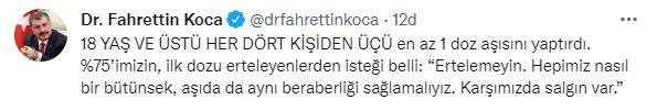 Sosyal medya hesabından paylaşım yapan Bakan Koca, "18 yaş ve üstü her dört kişiden üçü en az 1 doz aşısını yaptırdı. yüzde 75’imizin, ilk dozu erteleyenlerden isteği belli: 'Ertelemeyin. Hepimiz nasıl bir bütünsek, aşıda da aynı beraberliği sağlamalıyız. Karşımızda salgın var.'" açıklamasında bulundu.