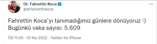 Sosyal medya hesabından son tablodaki vaka sayısını paylaşan Bakan Koca, ''Fahrettin Koca’yı tanımadığımız günlere dönüyoruz. Bugünkü vaka sayısı: 5.609.'' ifadelerini kullandı.