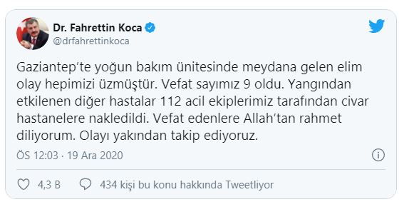 Bakan Koca, yangında hayatını kaybedenlere Allah'tan rahmet dilediğini belirterek olayı yakından takip ettiklerine ilişkin de bilgilendirmede bulundu.