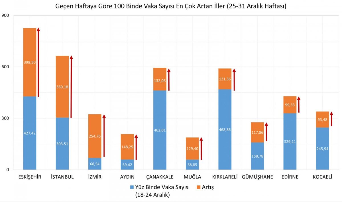 Bakan Koca, "25-31 Aralık arasında vaka yoğunluğu bir önceki haftaya göre en çok artan 10 ilimiz: Eskişehir, İstanbul, İzmir, Aydın, Çanakkale, Muğla, Kırklareli, Gümüşhane, Edirne, Kocaeli" ifadelerini kullandı.