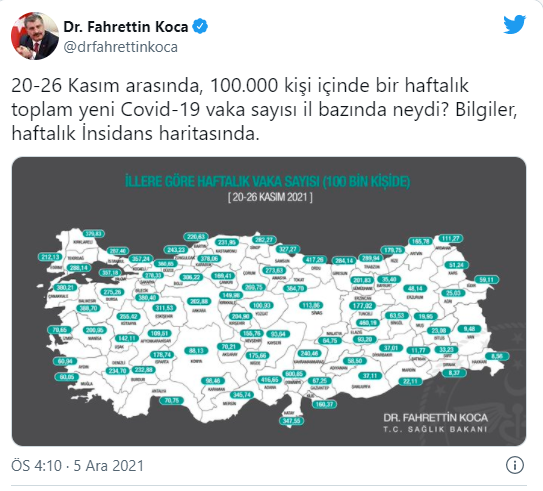 20-26 Kasım arasında vaka yoğunluğu bir önceki haftaya göre en çok artan 10 il ise şöyle: Osmaniye, Adana, Mersin, Hatay, Kırklareli, Çanakkale, Eskişehir, Burdur, Bilecik ve Edirne.