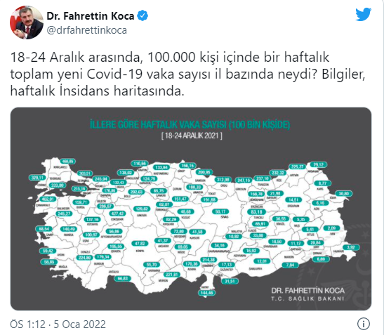 Bakan Koca haftalık vaka haritasını paylaştıSağlık Bakanı Fahrettin Koca, 18-24 Aralık tarihleri arasında illere göre 100 bin kişide görülen KOVID-19 vaka sayılarını açıkladı.05 Ocak 2022, Çarşamba - 13:16 Sağlık Bakanı Fahrettin Koca, 18-24 Aralık arasında, 100.000 kişi içinde bir haftalık toplam yeni Kovid-19 vaka sayısı haritasını paylaştı. Haritaya göre, İstanbul'da 100 bin kişide görülen vaka sayısı 303,51, Ankara'da 129,82, İzmir'de 68,54 oldu. Ekim ayında yağışlar geçen yıla göre artış gösterdiEtiketler: Fahrettin Koca Kovid-19