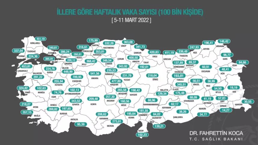Bakan Koca paylaşımında, "5-11 Mart arasında, 100.000 KİŞİ İÇİNDE bir haftalık toplam yeni Covid-19 vaka sayısı il bazında neydi? Yaşadığınız, gidip geldiğiniz ildeki durumu haftalık İnsidans haritamızdan öğrenebilirsiniz." ifadelerini kullandı.