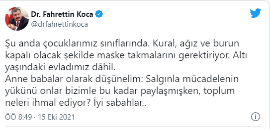 Bakan Koca paylaşımında, "Şu anda çocuklarımız sınıflarında. Kural, ağız ve burun kapalı olacak şekilde maske takmalarını gerektiriyor. Altı yaşındaki evladımız dâhil. Anne babalar olarak düşünelim: Salgınla mücadelenin yükünü onlar bizimle bu kadar paylaşmışken, toplum neleri ihmal ediyor? İyi sabahlar.." açıklamalarında bulundu.