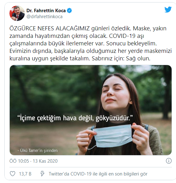 Bakan Koca, Twitter'daki paylaşımında Ülkü Tamer'in bir şiirindeki dizeye yer verdi. "İçime çektiğim hava değil gökyüzüdür." dizesinin yer aldığı bir fotoğraf paylaşan Bakan Koca, özgür bir şekilde nefes aldığımız günleri özlediğimizi belirterek maskenin yakın zamanda hayatlarımızdan çıkacağını, aşı çalışmalarında olumlu anlamda ilerlemeler olduğunu söyledi.