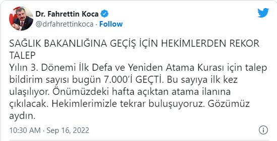 Sağlık Bakanı Fahrettin Koca, sosyal medya hesabından, Sağlık Bakanlığına geçiş için hekimlerden rekor talep geldiğini belirterek "Yılın 3. Dönemi İlk Defa ve Yeniden Atama Kurası için talep bildirim sayısı bugün 7 bini geçti. Bu sayıya ilk kez ulaşılıyor. Önümüzdeki hafta açıktan atama ilanına çıkılacak. Hekimlerimizle tekrar buluşuyoruz. Gözümüz aydın." ifadesini kullandı.
