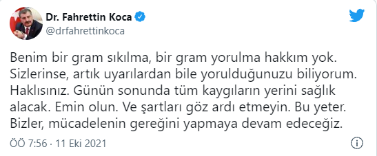 Koca, Twitter hesabından yaptığı açıklamada "Benim bir gram sıkılma, bir gram yorulma hakkım yok. Sizlerinse, artık uyarılardan bile yorulduğunuzu biliyorum. Haklısınız. Günün sonunda tüm kaygıların yerini sağlık alacak. Emin olun. Ve şartları göz ardı etmeyin. Bu yeter. Bizler, mücadelenin gereğini yapmaya devam edeceğiz" ifadelerini kaydetti.