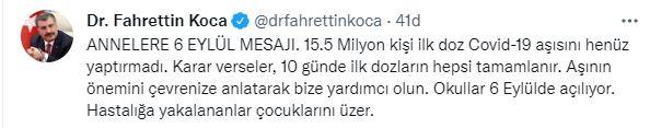 "ANNELERE 6 EYLÜL MESAJI. 15.5 Milyon kişi ilk doz Covid-19 aşısını henüz yaptırmadı. Karar verseler, 10 günde ilk dozların hepsi tamamlanır. Aşının önemini çevrenize anlatarak bize yardımcı olun. Okullar 6 Eylülde açılıyor. Hastalığa yakalananlar çocuklarını üzer.