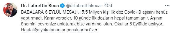 BABALARA 6 EYLÜL MESAJI. 15.5 Milyon kişi ilk doz Covid-19 aşısını henüz yaptırmadı. Karar verseler, 10 günde ilk dozların hepsi tamamlanır. Aşının önemini çevrenize anlatarak bize yardımcı olun. Okullar 6 Eylülde açılıyor. Hastalığa yakalananlar çocuklarını üzer."