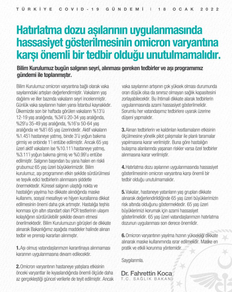 Salgının başından bu yana halen en riskli grubumun 65 yaş üzeri büyükler olduğuna dikkat çeken Bakan Koca, “Bilim kurulumuz, aşı programının etkin şekilde sürdürülmesi ve teşvik edici tedbirlerin alınmasını şiddetle önermektedir. Küresel salgının ulaştığı nokta ve hastalığın yayılma hızı dikkate alındığında maske kullanımı, sosyal mesafeye ve hijyen kurallarına dikkat edilmesinin önemi daha çok artmıştır. Hastalığa teşhis konması için altın standart olan PCR testlerinin ulaşım kolaylığının sürdürülebilir şekilde devam etmesi önerilmektedir” açıklamasında bulundu.