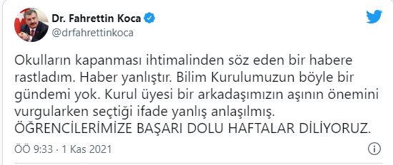 Bakan Koca, "Okulların kapanması ihtimalinden söz eden bir habere rastladım. Haber yanlıştır. Bilim Kurulumuzun böyle bir gündemi yok. Kurul üyesi bir arkadaşımızın aşının önemini vurgularken seçtiği ifade yanlış anlaşılmış. ÖĞRENCİLERİMİZE BAŞARI DOLU HAFTALAR DİLİYORUZ." dedi.