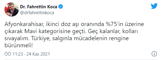 "Afyonkarahisar, ikinci doz aşı oranında %75’in üzerine çıkarak Mavi kategorisine geçti. Geç kalanlar, kolları sıvayalım. Türkiye, salgınla mücadelenin rengine bürünmeli!"