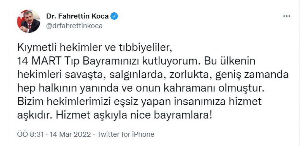 "Kıymetli hekimler ve tıbbiyeliler, 14 Mart Tıp Bayramınızı kutluyorum. Bu ülkenin hekimleri savaşta, salgınlarda, zorlukta, geniş zamanda hep halkının yanında ve onun kahramanı olmuştur. Bizim hekimlerimizi eşsiz yapan insanımıza hizmet aşkıdır. Hizmet aşkıyla nice bayramlara."