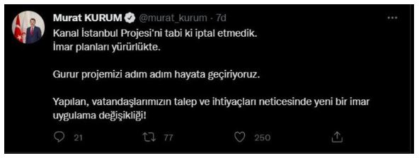 Bakan Kurum, Twitter'daki hesabından yaptığı açıklamada, "Kanal İstanbul Projesi'ni tabi ki iptal etmedik. İmar planları yürürlükte. Gurur projemizi adım adım hayata geçiriyoruz. Yapılan, vatandaşlarımızın talep ve ihtiyaçları neticesinde yeni bir imar uygulama değişikliği" dedi.