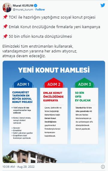 "Üç adımda yeni konut hamlesi" başlığı altında yapılacakları sıralayan Bakan Kurum'un paylaşımı: