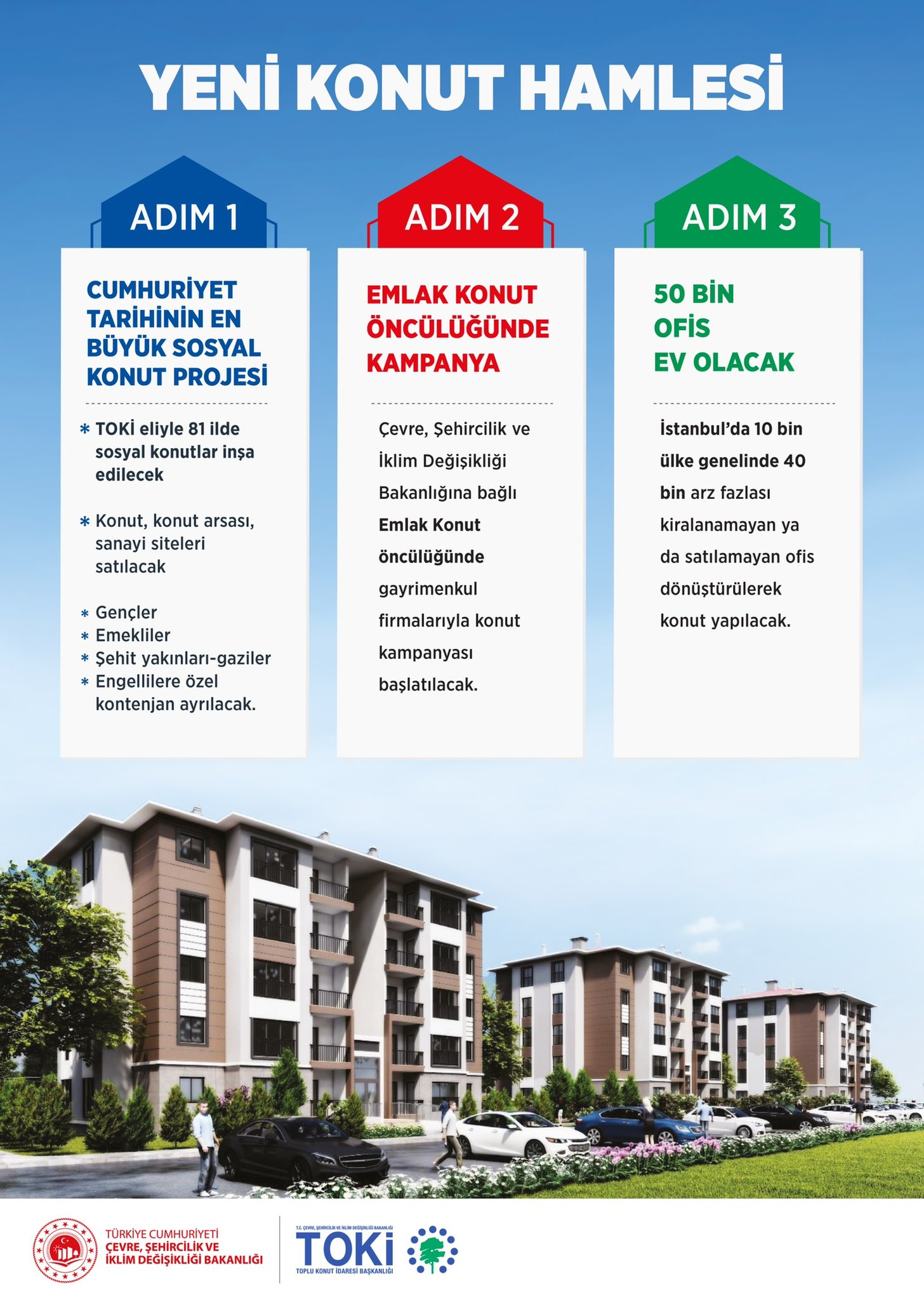 Üçüncü adım: İstanbul genelinde 10 bin, ülke genelinde 40 bin arz fazlası kiralanamayan ya da satılamayan 50 bin ofis dönüştürülerek konut olacak."