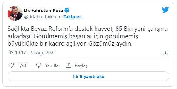 Sağlık Bakanı Fahrettin Koca, resmi Twitter hesabından bir paylaşımda bulundu. Beyaz Reform'a 85 bin kadro açılacağını duyurdu.