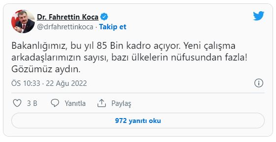 "Bakanlığımız, bu yıl 85 bin kadro açıyor. Yeni çalışma arkadaşlarımızın sayısı, bazı ülkelerin nüfusundan fazla. Sağlıkta 'Beyaz Reform'a destek kuvvet, 85 bin yeni çalışma arkadaşı! Görülmemiş başarılar için görülmemiş büyüklükte bir kadro açılıyor. Gözümüz aydın."