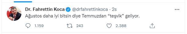 Bakan Koca, sosyal medya hesabından "Ağustos daha iyi bitsin diye Temmuzdan 'teşvik” geliyor.' ifadelerini kullandı.