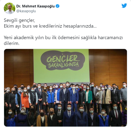 Bakan müjdeyi verdi: Hesaplara yatırıldıGençlik ve Spor Bakanı Mehmet Muharrem Kasapoğlu, yükseköğrenim öğrencilerinin ekim ayı burs ve kredi ödemelerinin hesaplara yatırıldığını açıkladı.06 Ekim 2021, Çarşamba - 09:40 Gençlik ve Spor Bakanı Mehmet Kasapoğlu, Twitter hesabından yaptığı paylaşımda şu ifadeleri kullandı:"Sevgili gençler, Ekim ayı burs ve kredileriniz hesaplarınızda. Yeni akademik yılın bu ilk ödemesini sağlıkla harcamanızı dilerim."Almanya’da faaliyet gösteren Türk İş insanından küresel kriz uyarısıEtiketler: Mehmet Kasapoğlu kredi burs