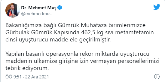 Bakan Muş açıklamasında: "Bakanlığımıza bağlı Gümrük Muhafaza birimlerimizce Gürbulak Gümrük Kapısında 462,5 kg sıvı metamfetamin cinsi uyuşturucu madde ele geçirilmiştir. Yapılan başarılı operasyonla rekor miktarda uyuşturucu maddenin ülkemize girişine izin vermeyen personellerimizi tebrik ediyorum." ifadelerini kullandı.