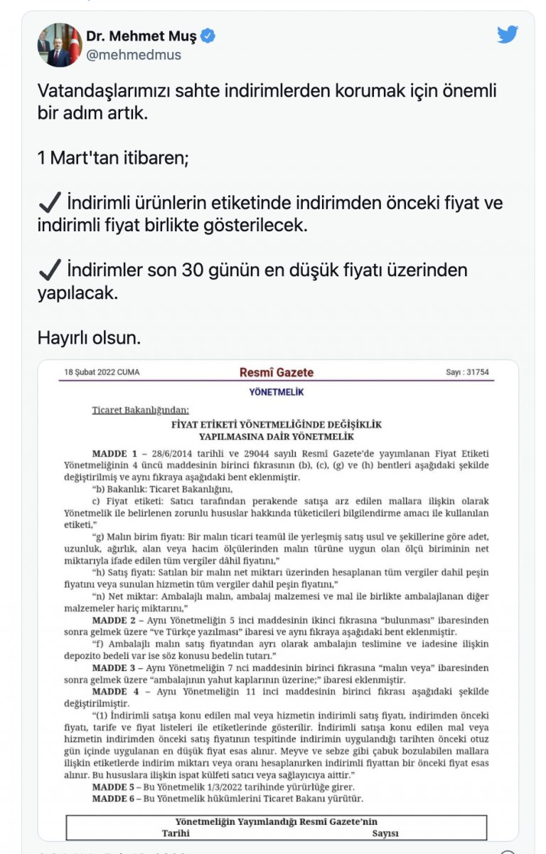 Ticaret Bakanı Mehmet Muş, Twitter hesabından yaptığı paylaşımda, düzenlemeye ilişkin bilgi verdi.